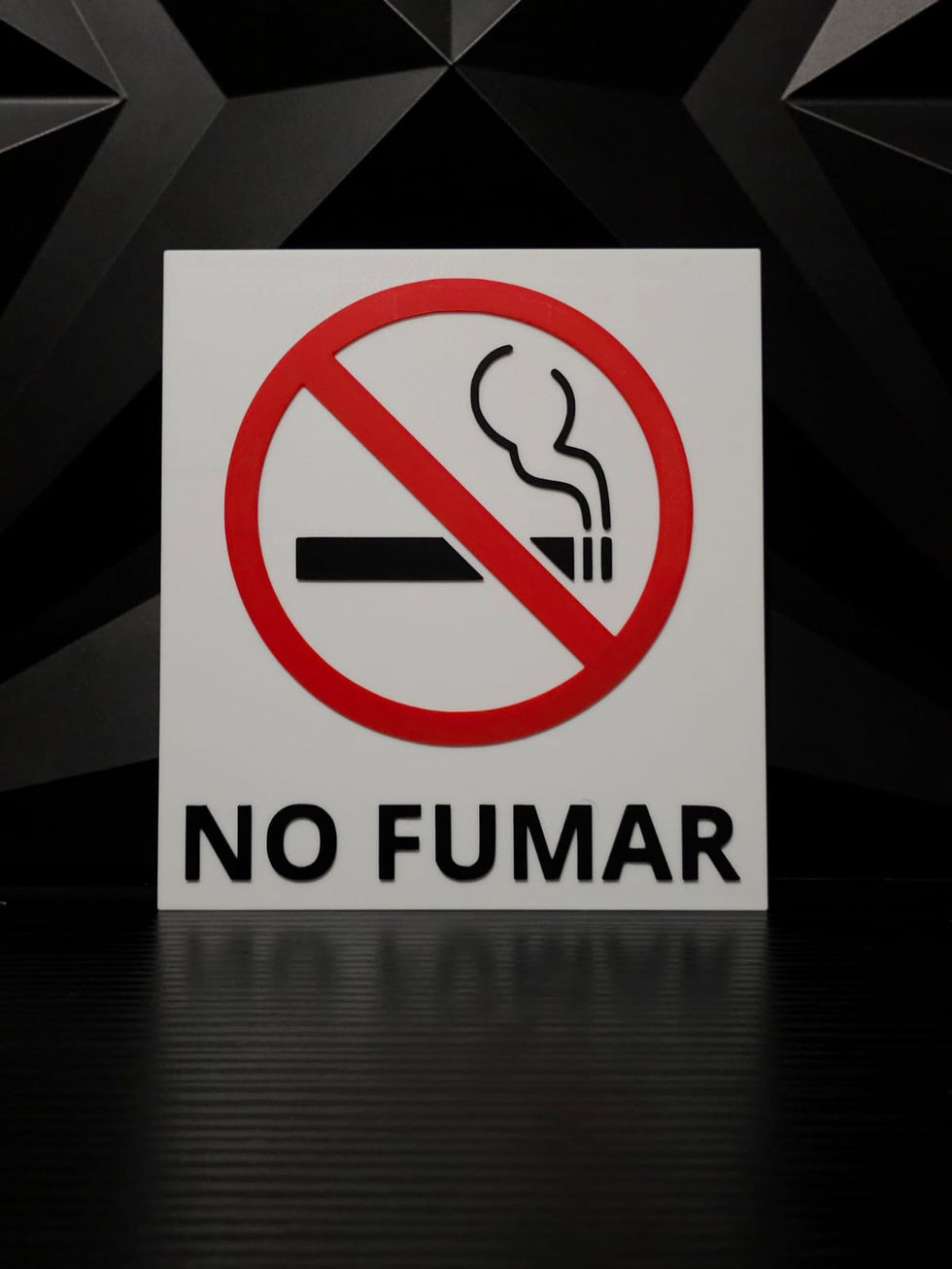 This project focuses on safety signage including a red fire extinguisher sign with a downward arrow, a "No fumar" sign with a no smoking symbol, and two green "Ruta de Evacuación" signs with arrows.